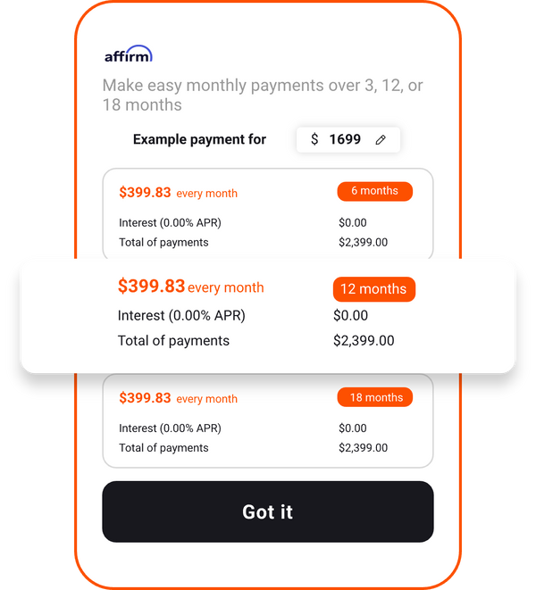 Your rate will be 0% APR or 10–30% APR based on credit, and is subject to an eligibility check. Payment options through Affirm are provided by these lending partners: affirm.com/lenders. Options depend on your purchase amount, and a down payment may be required.