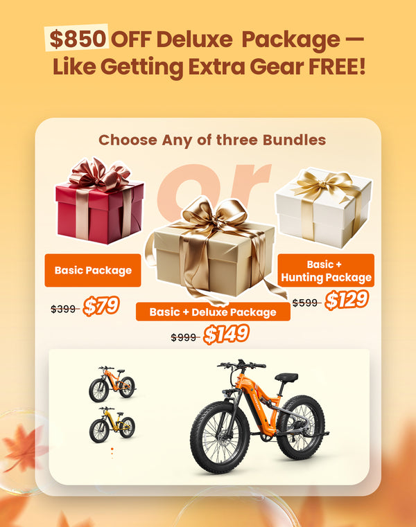 Premium Package: Originally $999-Includes: Basic Package+ Headlight、Front Basket、Helmet-Black、Battery protective cover、Riding Glasses、Rear rack bag.
