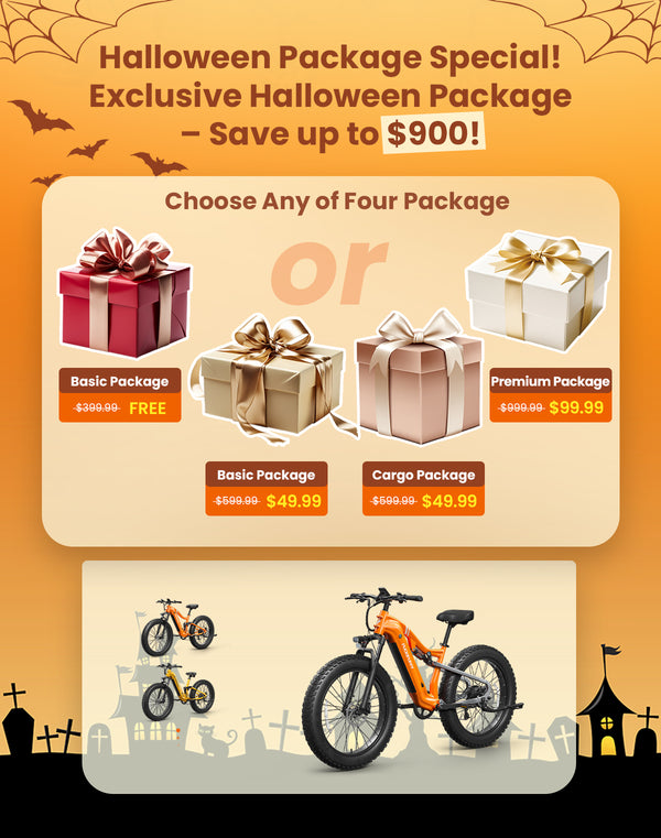 Premium Package: Originally $999.99-Includes: Basic Package+ Headlight、Front Basket、Helmet-Black、Battery protective cover、Riding Glasses、Rear rack bag.