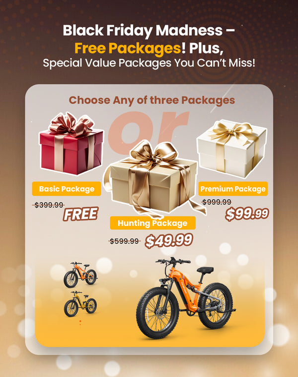 Premium Package: Originally $999.99-Includes: Basic Package+ Headlight、Front Basket、Helmet-Black、Battery protective cover、Riding Glasses、Rear rack bag.